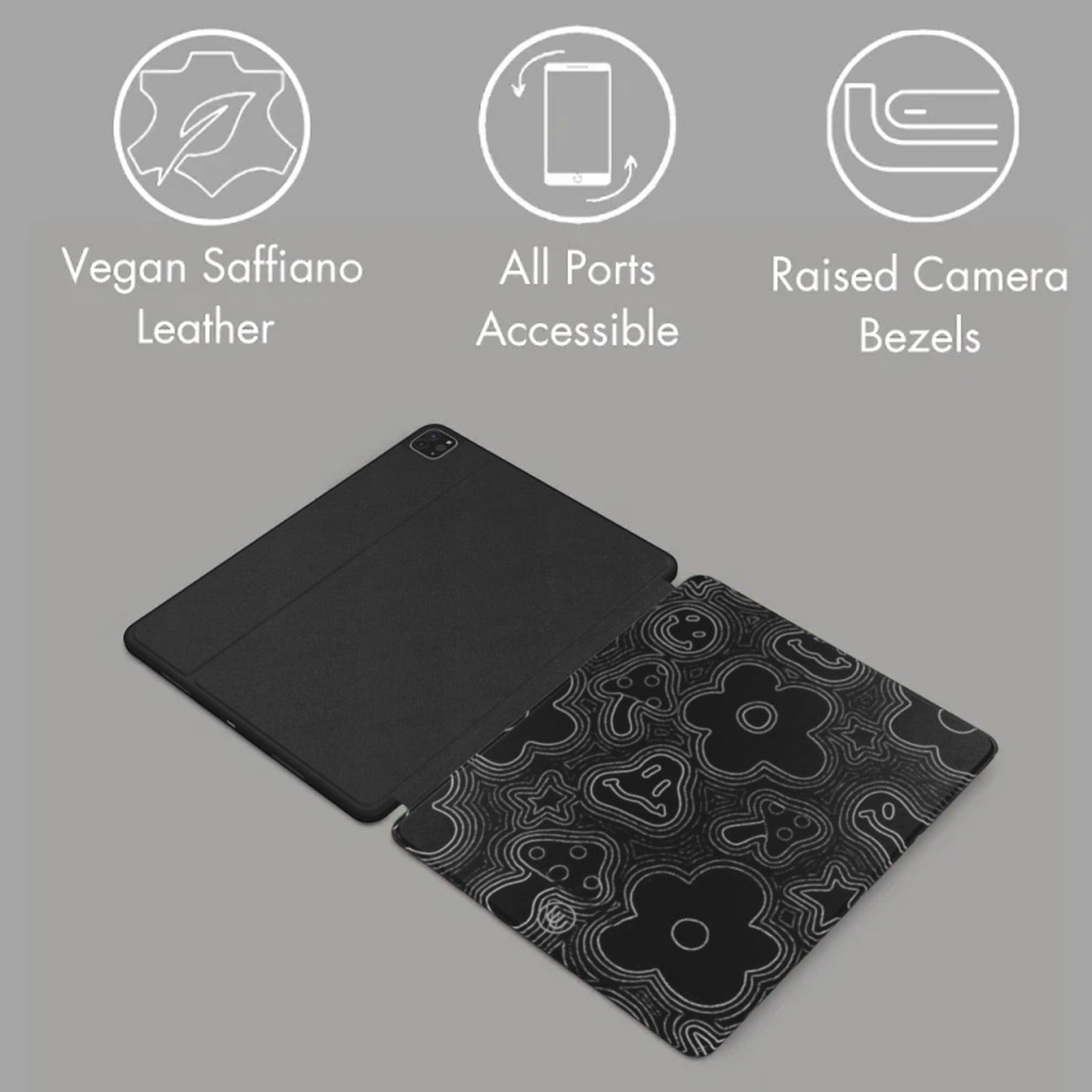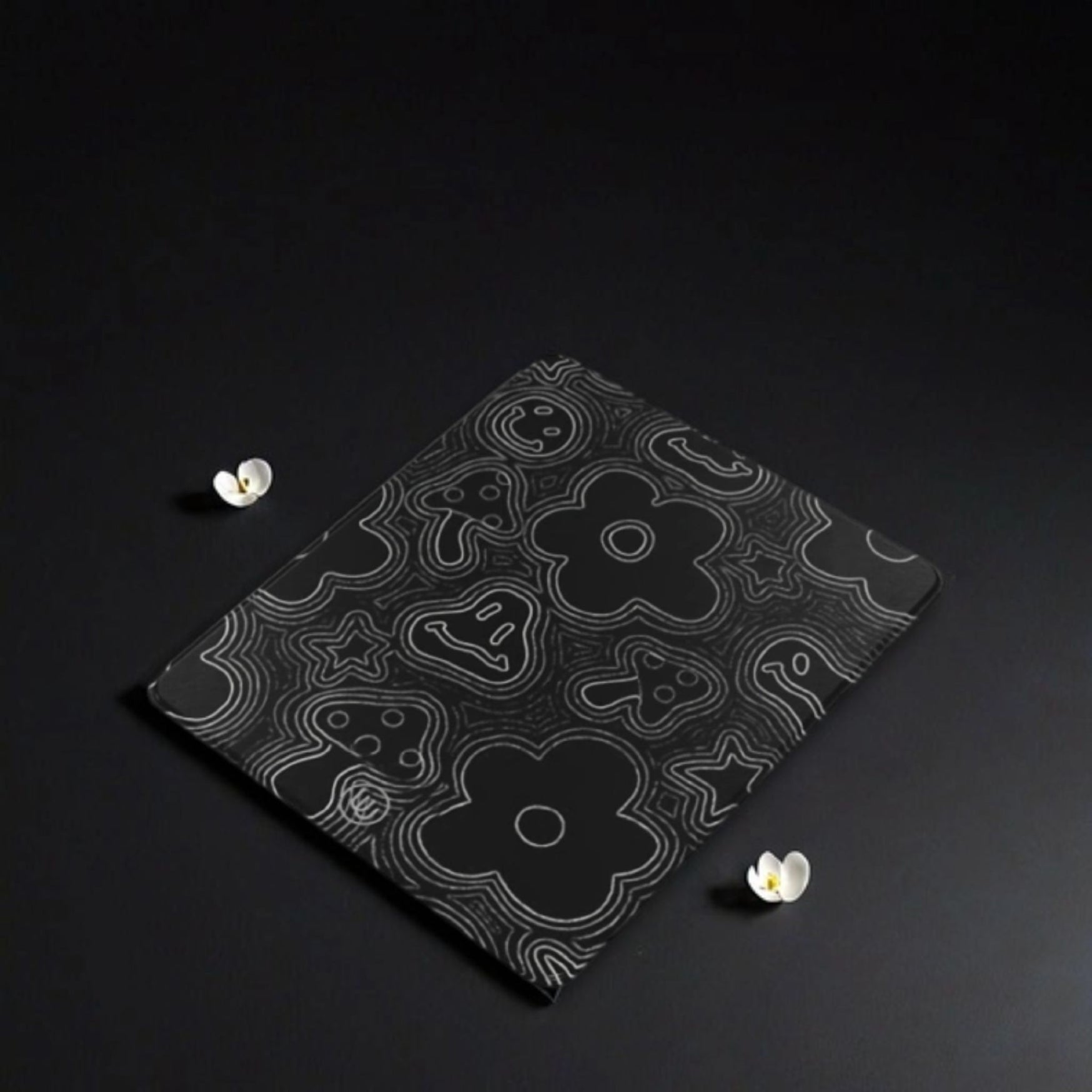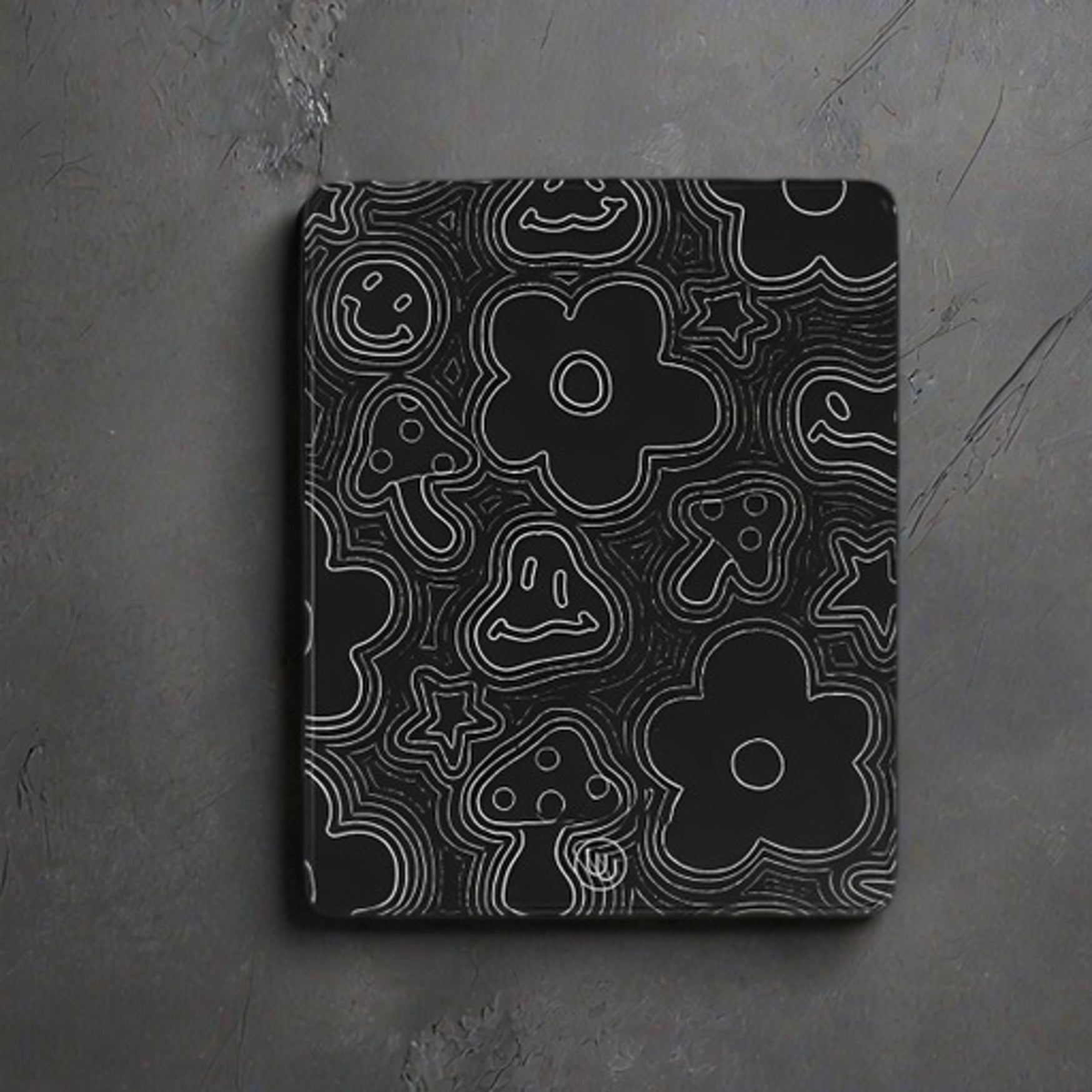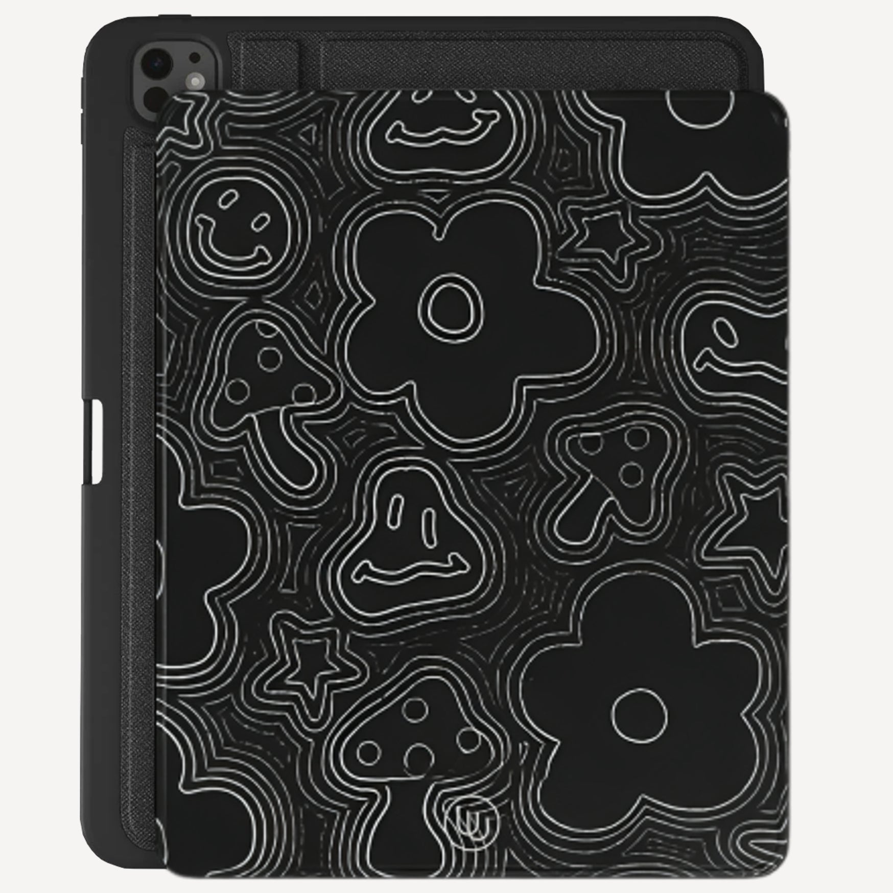 Add some style to your iPad with Water Style! This iPad case features a unique pattern of flowers, mushrooms, stars, and smiles in a black and white color scheme. The wavy lines create a whimsical and playful design.