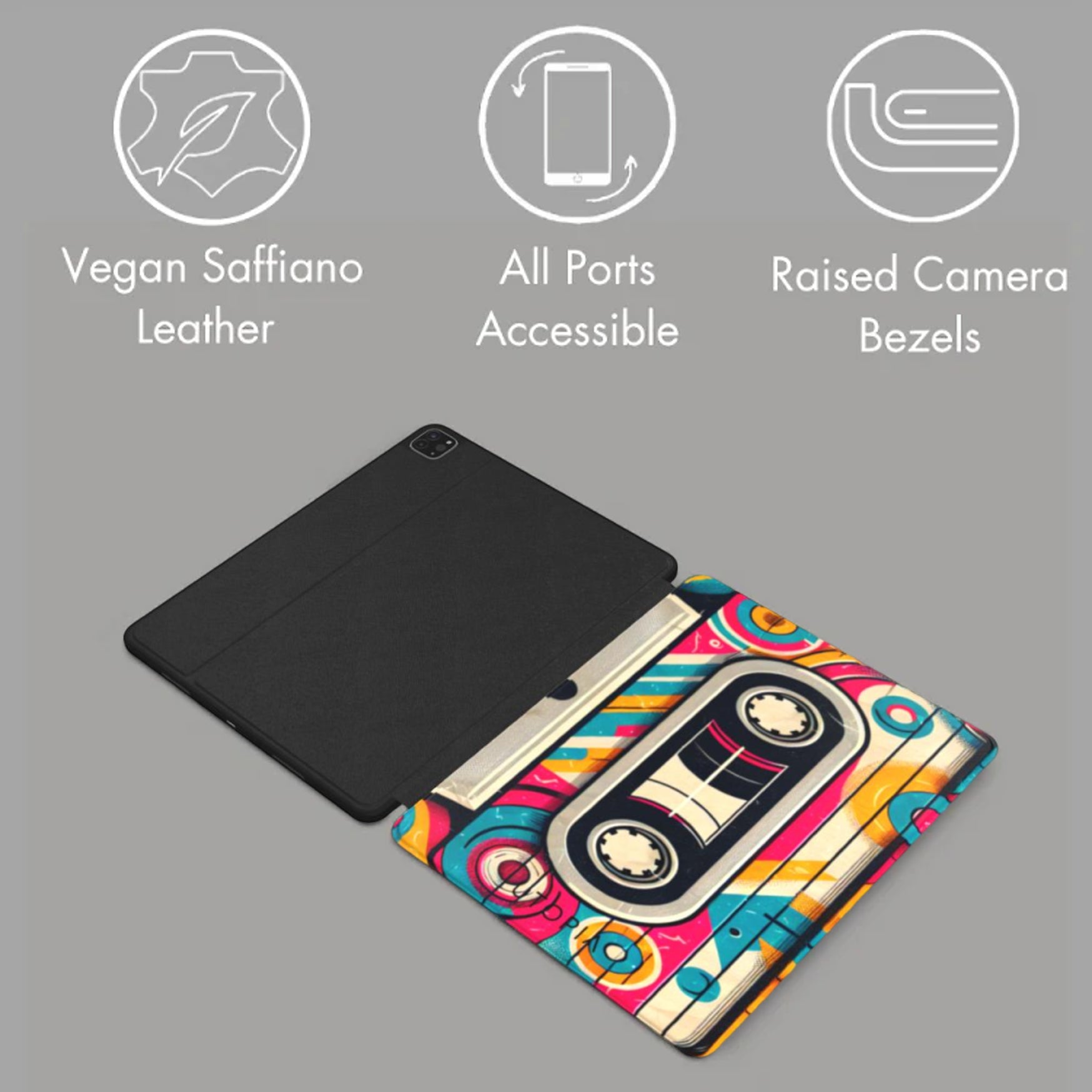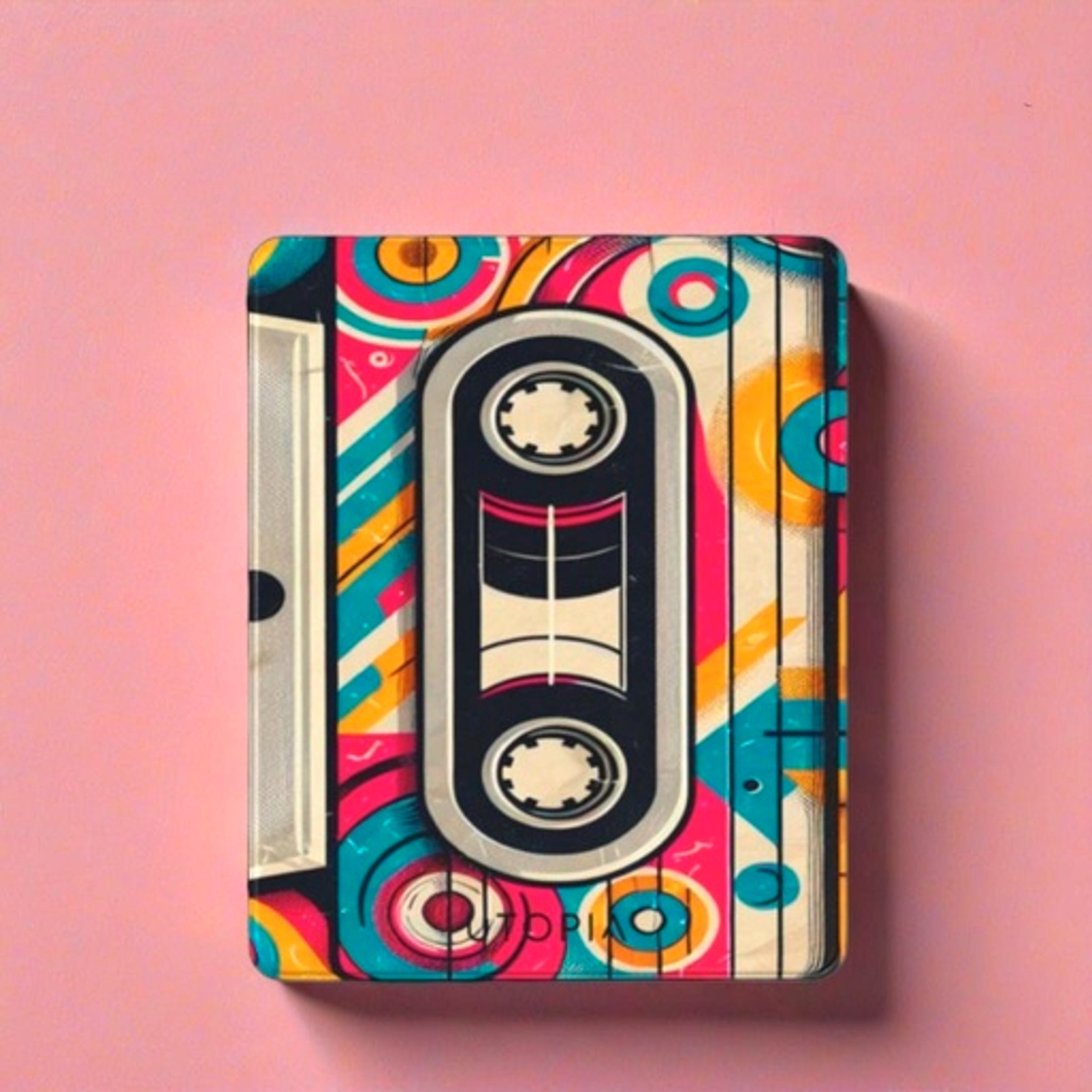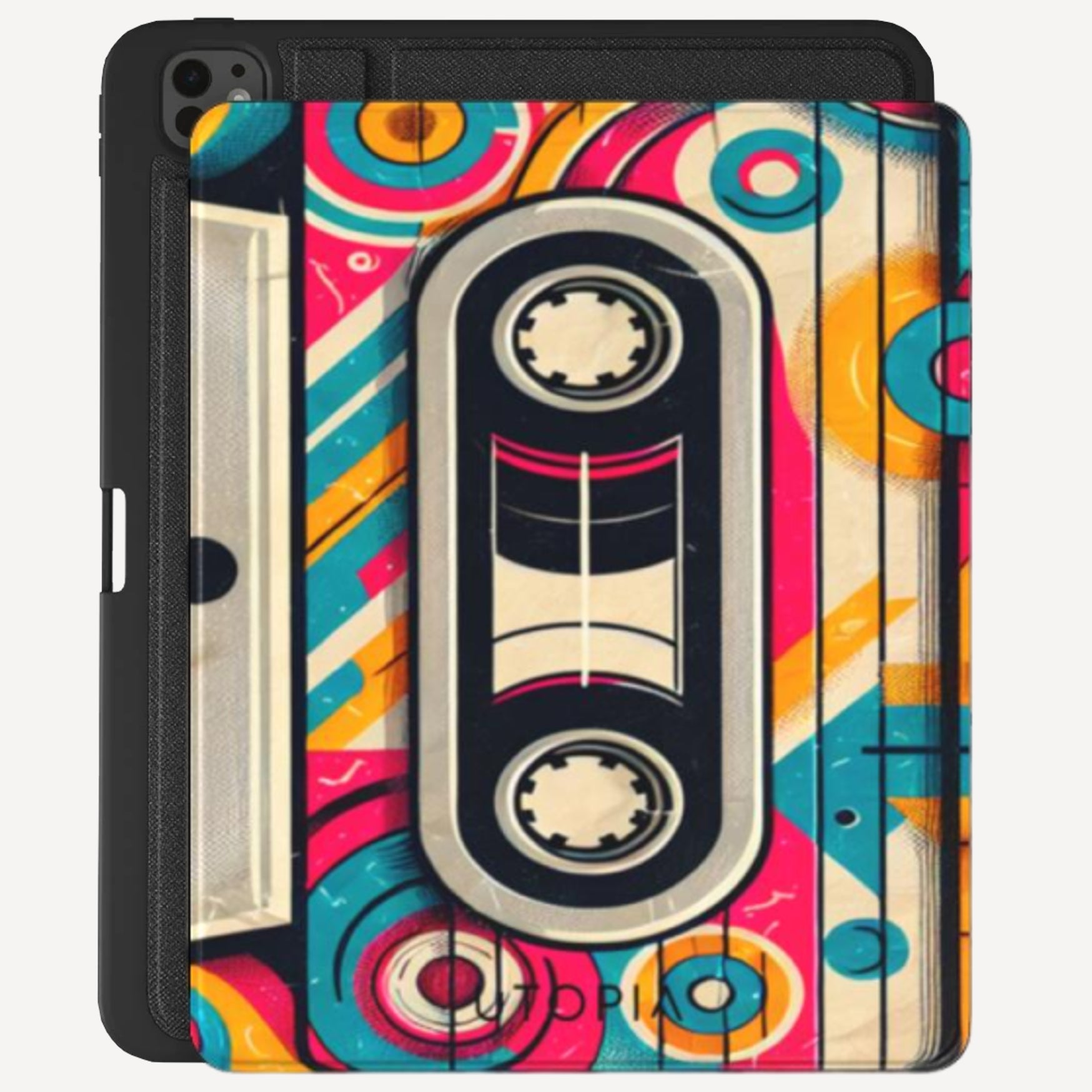 Revamp your iPad with Rewind, the colorful cassette tape phone case. With abstract geometric patterns and bold circular designs in blue, orange, pink, and white tones, this case adds a touch of vintage style to your modern device. Protect your iPad in style and stand out from the crowd with Rewind.