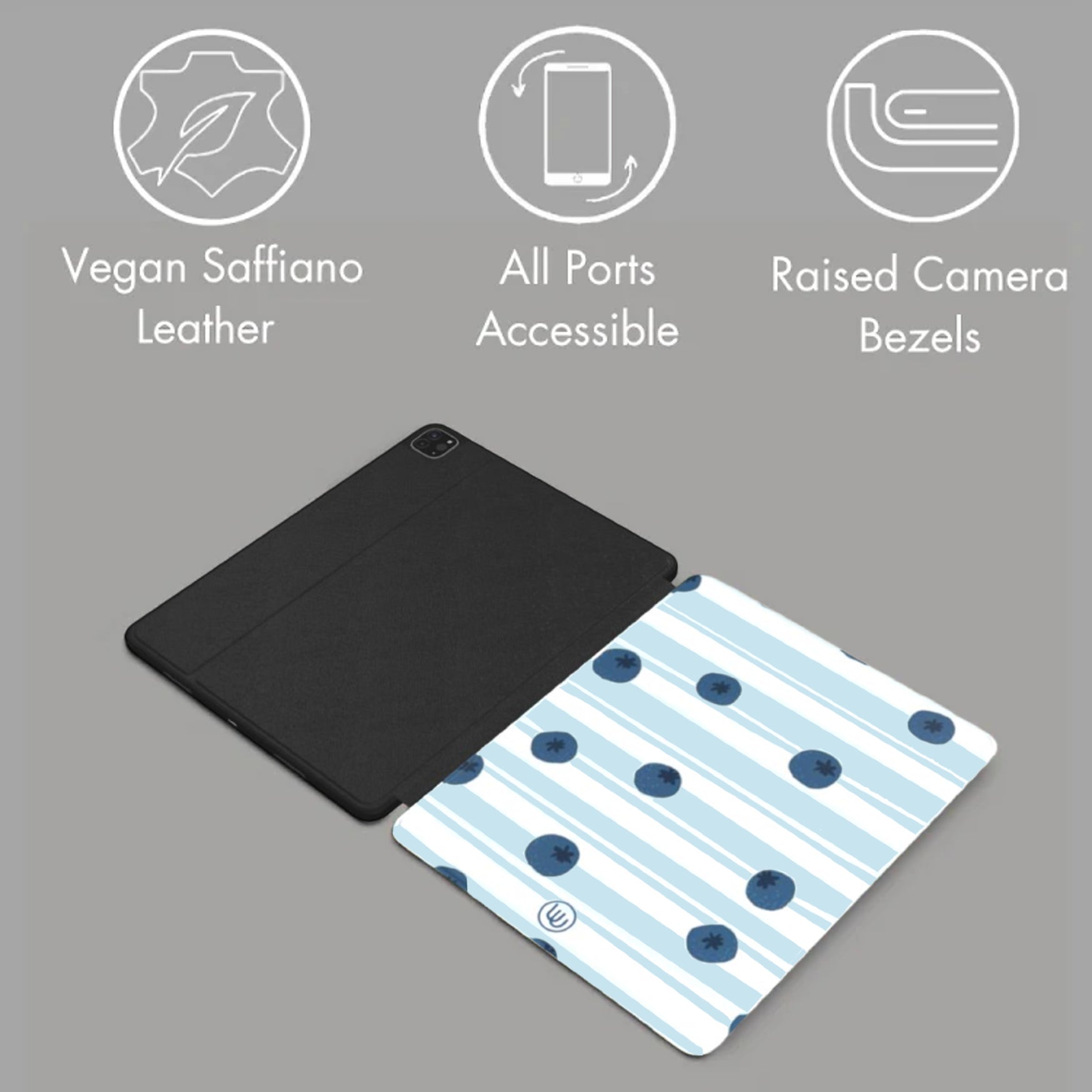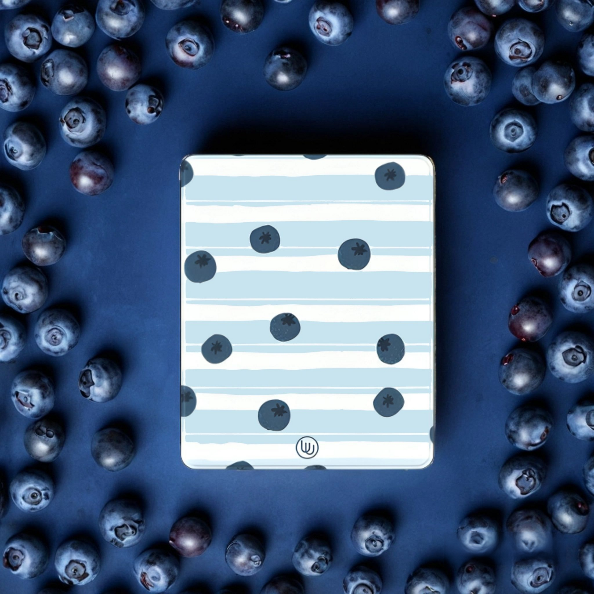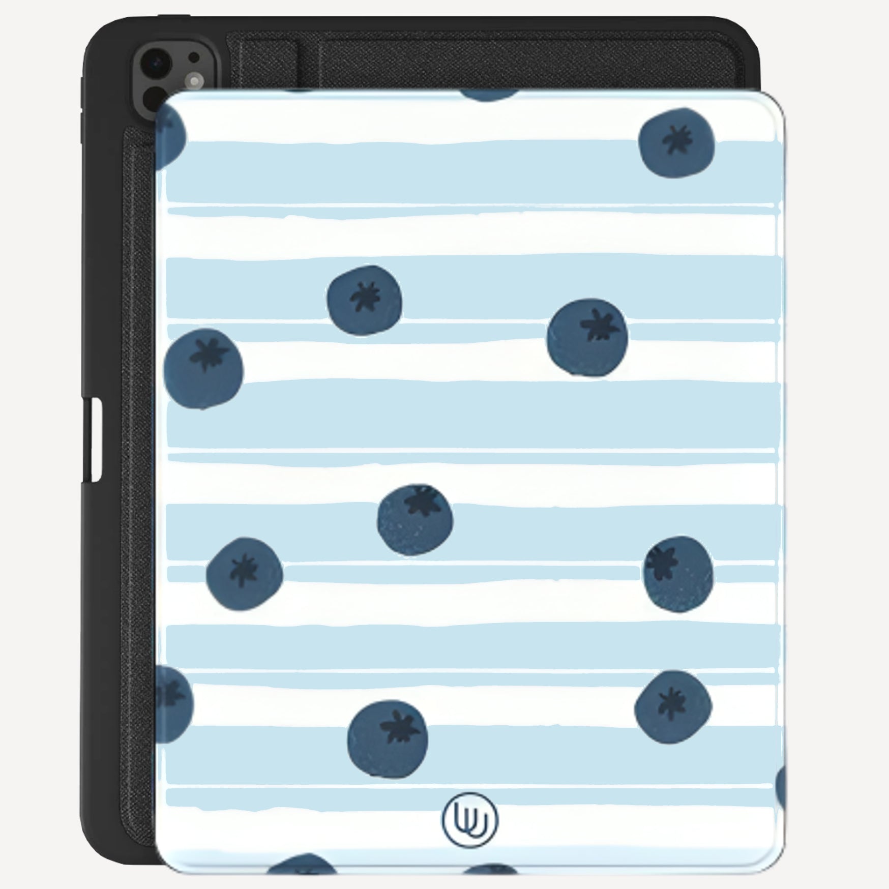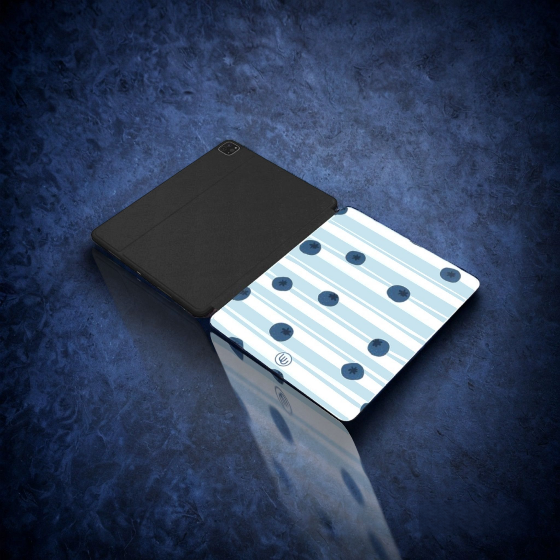 Introducing Sweeter - a patterned design with dark blue circles resembling blueberries on a light blue and white striped background. This playful and unique design is sure to add a pop of fun to any device. Don't be blue, add some sweetness to your iPad with Sweeter!