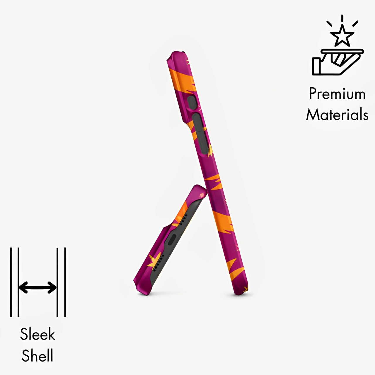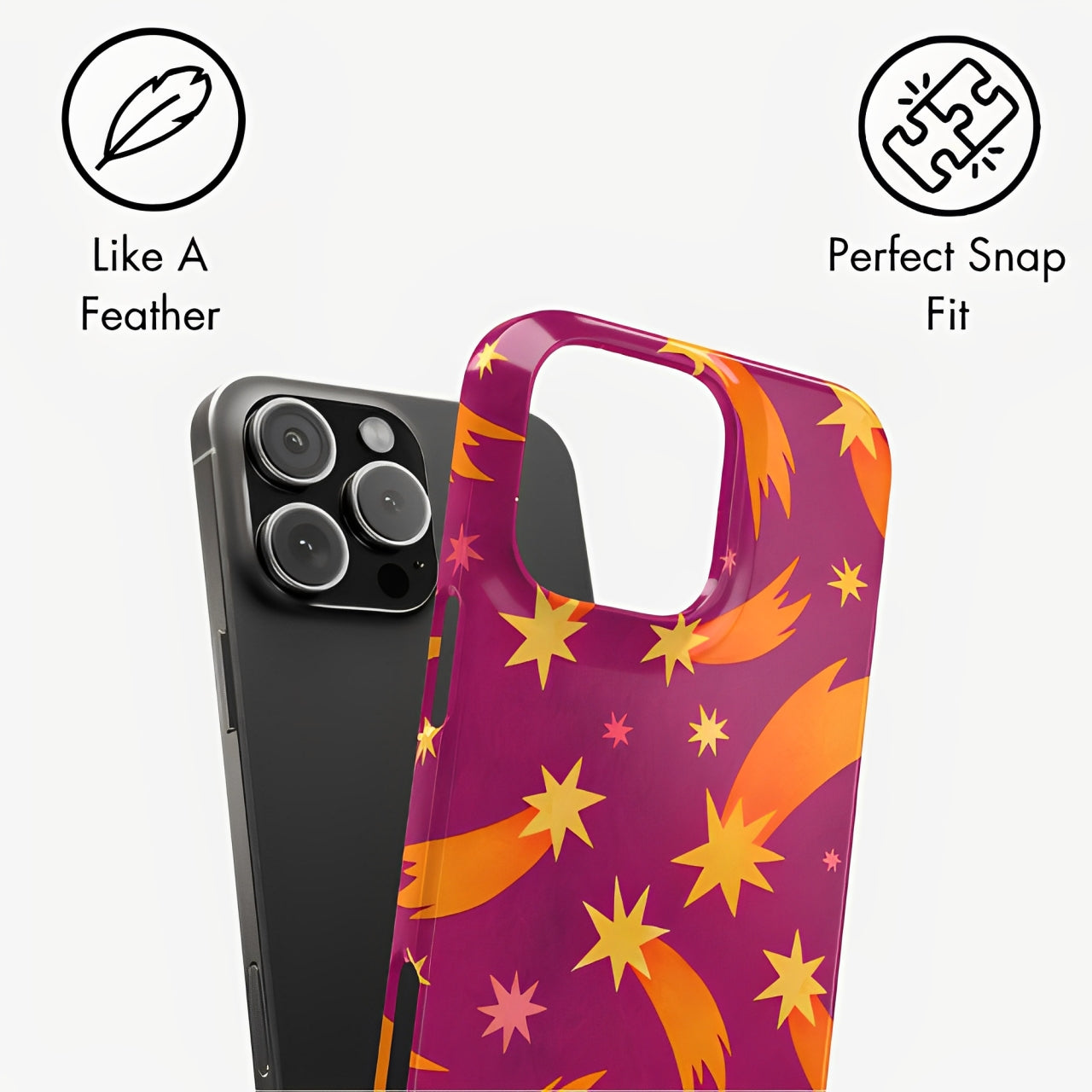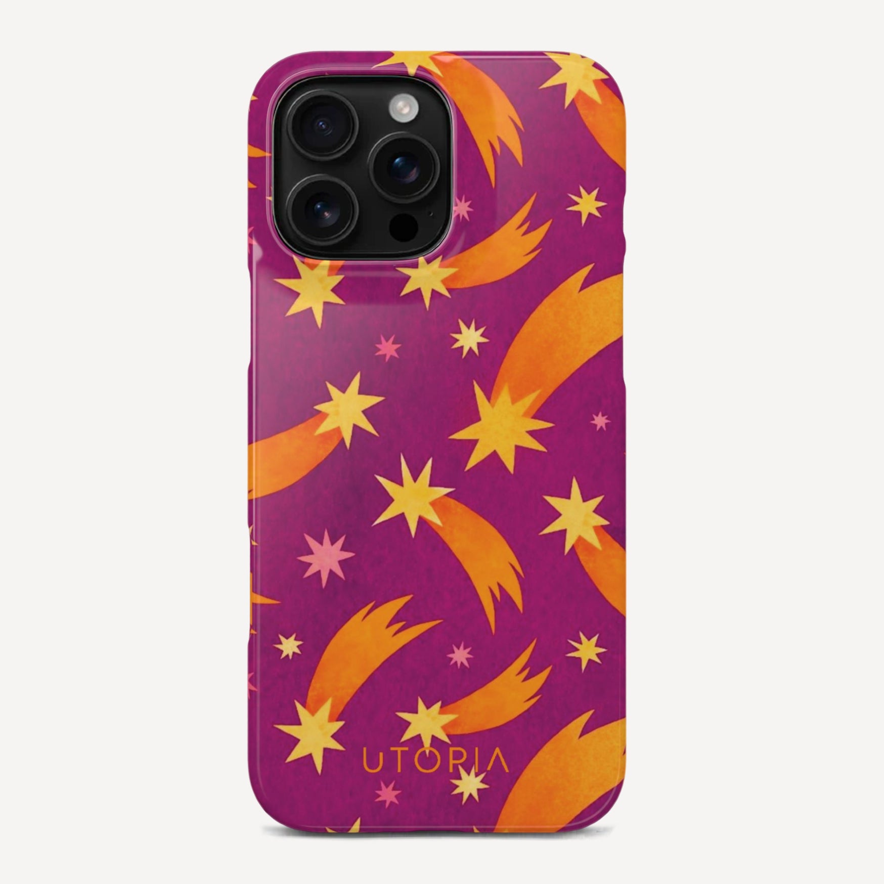The Wishes phone case lights up your device with a playful pattern of yellow and orange shooting stars streaking across a rich purple background. Perfect for adding a touch of magic and fun, this case lets your phone shine bright while keeping it protected. Make every wish count with Wishes!