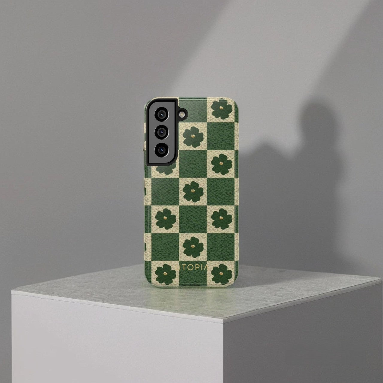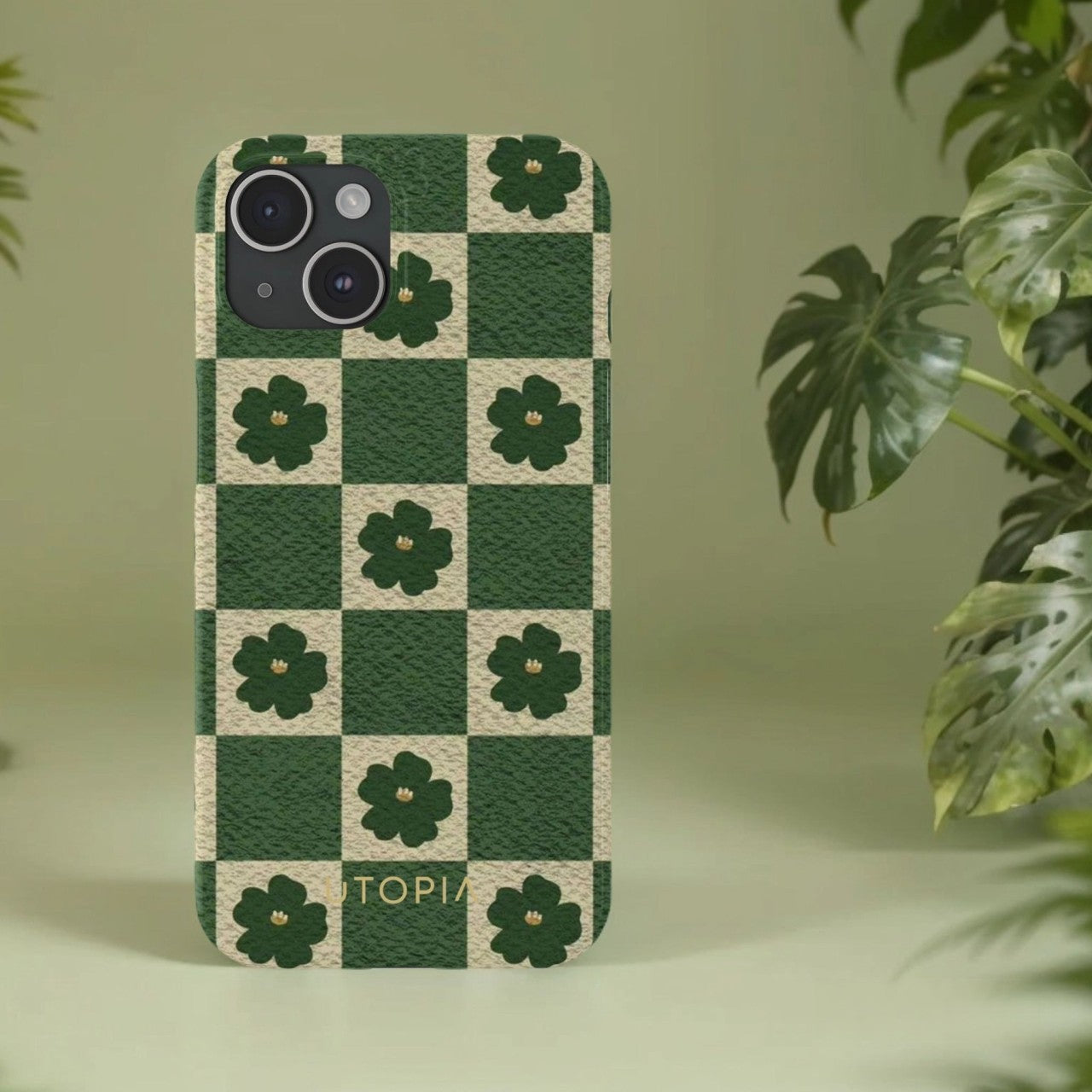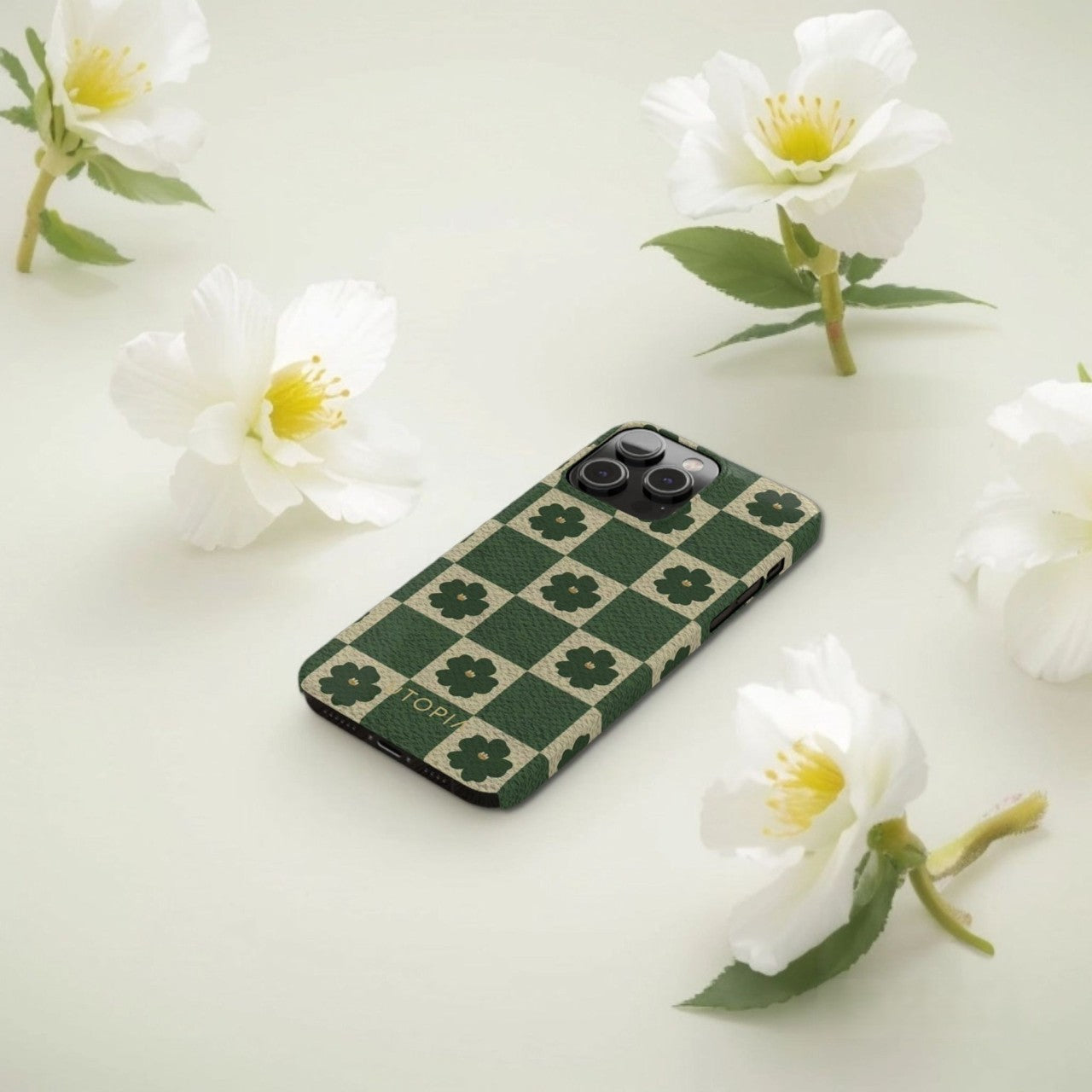 Add a touch of joy to your phone with Charm. This playful phone case features a green and white checkered pattern, adorned with delicate flowers for a vibrant and cheerful design. Protect your phone while adding a fun and quirky touch to your everyday style.
