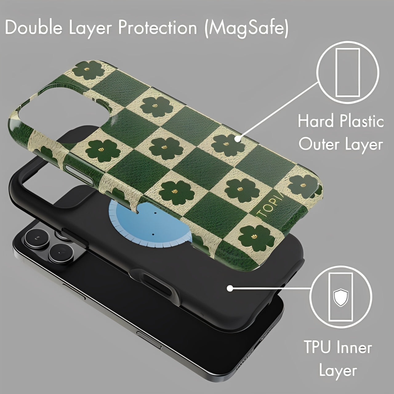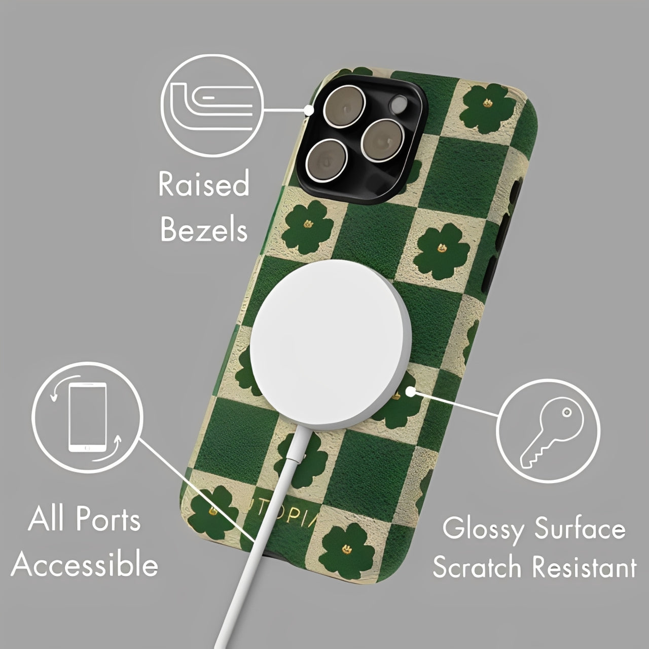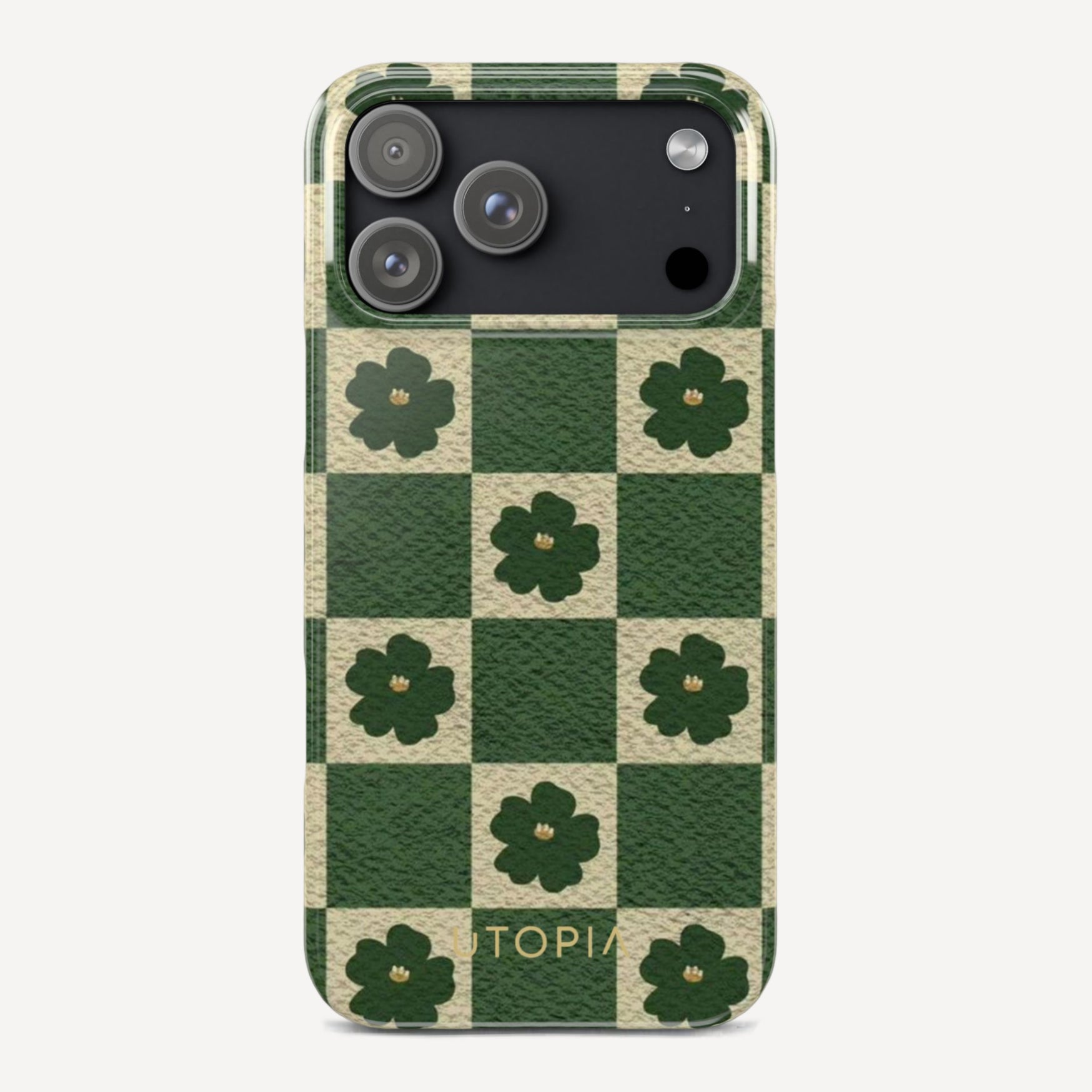 Add a touch of joy to your phone with Charm. This playful phone case features a green and white checkered pattern, adorned with delicate flowers for a vibrant and cheerful design. Protect your phone while adding a fun and quirky touch to your everyday style.